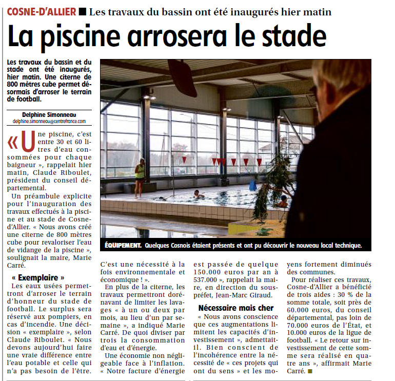 La mission pour la récupération et le traitement des eaux rejetées de la piscine Clairval à Cosne d’Allier, en vue de l’arrosage du complexe sportif et des espaces verts, incarne une démarche durable.